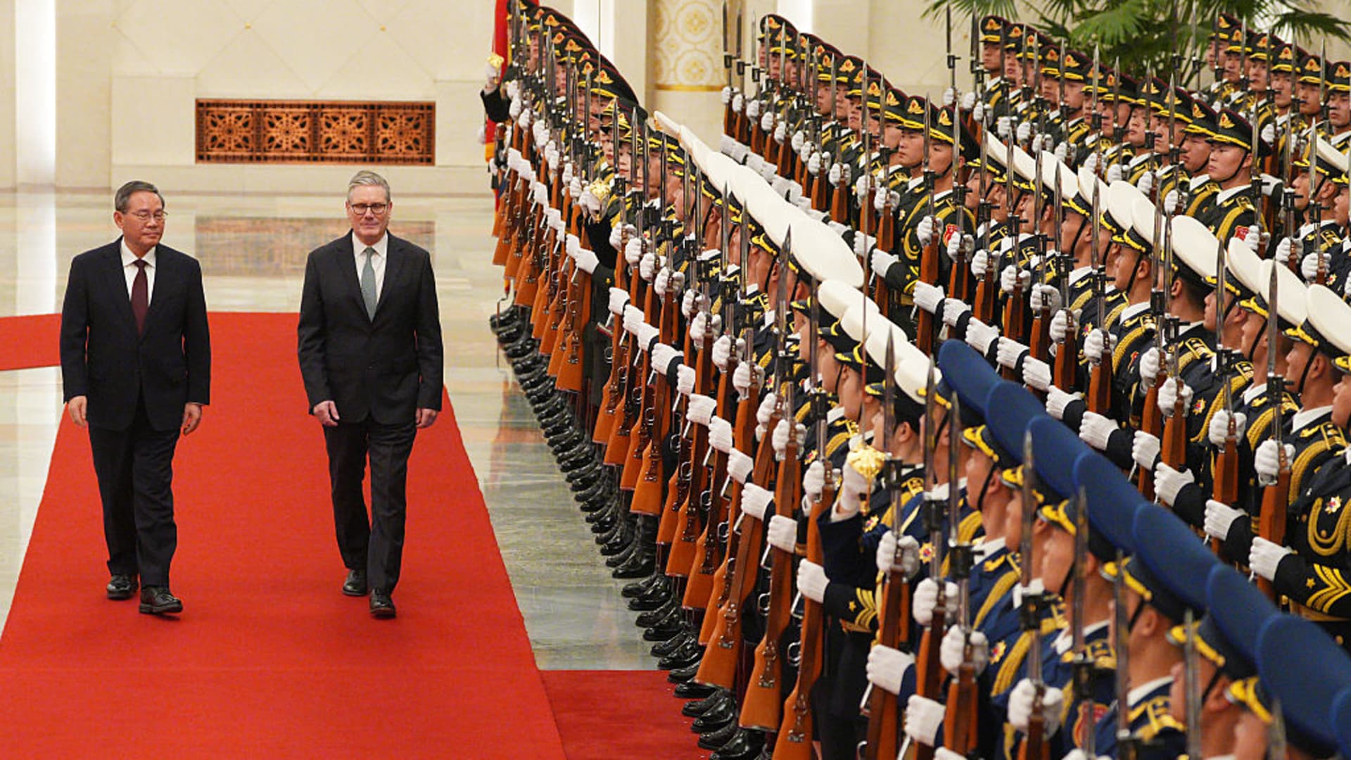 British Prime Minister Keir Starmer attends a ceremonial welcome with Li Qiang, Premier of the People’s Republic of China, ahead of their meeting at the Great Hall of The People during his visit to China, on January 29, 2026 in Beijing, China.